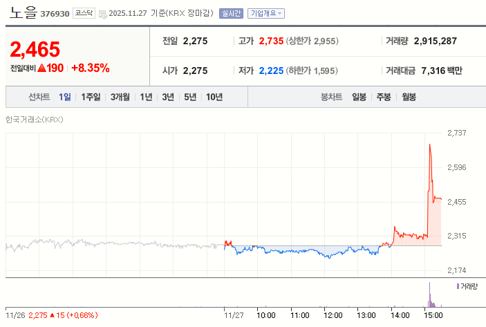 그러나 상승분을 모두 지키지 못하고 오후 3시 15분 2,450원까지 하락하며 변동성을 보였다. 종가는 전날 대비 8.35% 상승한 2,465원으로 마감했다.