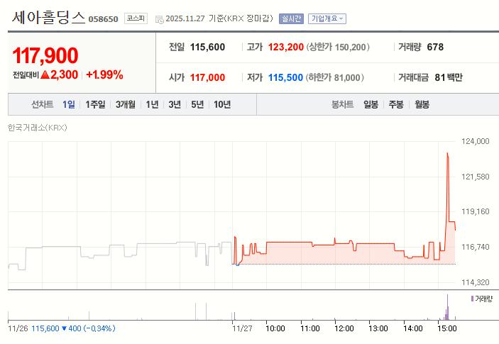 그러나 장 마감 직전 매도 물량이 출회되며 오후 3시 19분 118,500원까지 하락했다. 종가는 전날 대비 2.08% 상승한 117,900원으로 장을 마쳤다.